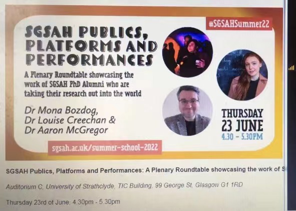 (一)2022年6月23日-24日苏格兰艺术与人文研究生协会年会 线上 该会议系英国苏格兰研究生协会艺术与人文分会2022年年会。会议集中展现了苏格兰艺术与人文研究生研究中主要成果。邢丹同志参加了此次会议并在分组讨论中进行了积极讨论与互动