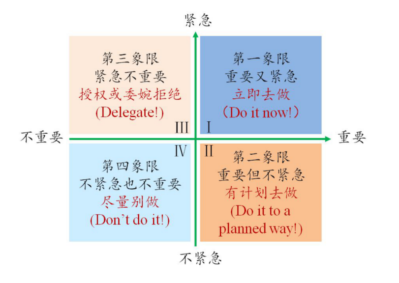 “时间四象限法”是美国的管理学家科维提出的一个时间管理的理论,该理论把工作按照重要和紧急两个维度进行划分,形成了四个象限,分别是“重要且紧急、重要但不紧急、紧急但不重要和不紧急也不重要”。