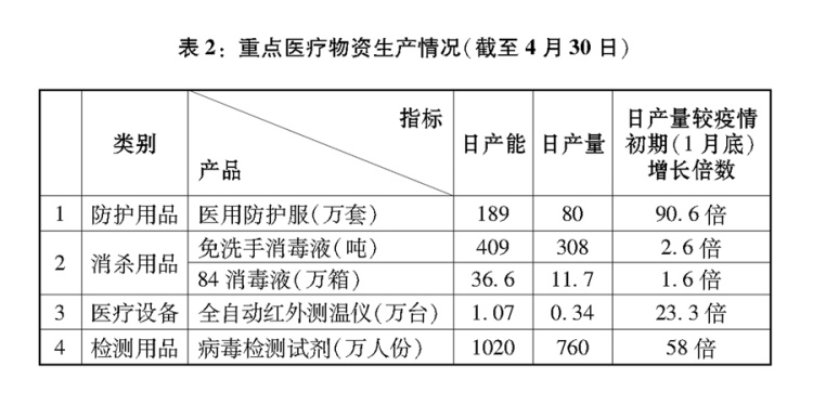 大力加强医疗物资生产供应和医疗支持服务。疫情防控阻击战,也是后勤保障战。疫情初期,武汉市医疗防护物资极度短缺,为了节省防护用品、争分夺秒抢救病患,一线医护人员克服困难,最大限度地延长防护用品使用时间。为尽快解决医疗资源短缺和病患急剧增多的突出矛盾,中国充分发挥制造业门类全、韧性强和产业链完整配套的优势,克服春节假期停工减产等不利因素,开足马力,深挖潜力,全力保障上下游原料供应和物流运输,保证疫情防控物资的大规模生产与配送。医疗企业克服工人返岗不足等困难,以最快速度恢复医疗用品生产,最大限度扩大产能。其他行业企业迅速调整转产,生产口罩、防护服、消毒液、测温仪等防疫物资,有效扩大了疫情防控物资的生产供应。快速启动防控医疗物资应急审批程序,全面加强质量安全监管,确保以最快的速度批准上市、促产保供,截至5月31日,共应急批准17个药物和疫苗的19件临床试验申请,附条件批准2个疫情防控用药上市。在各方共同努力下,医用物资产能不断提升,医用物资保供实现从“紧缺”到“紧平衡”“动态平衡”“动态足额供应”的跨越式提升(表2)。2月初,医用非N95口罩、医用N95口罩日产量分别为586万只、13万只,到4月底分别超过2亿只、500万只。畅通供应链条和物流渠道,建立联保联供协作机制,源源不断地把全国支援物资运送到疫情防控重点地区。