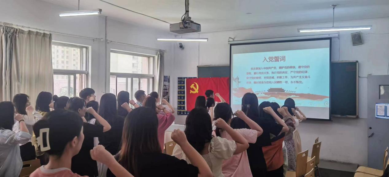 最后,毕业生党员们重温入党誓词。大家举起右手,在党旗下庄严宣誓。同志们高亢而又洪亮的声音,铿锵有力地重温了那铮铮誓言:“我志愿加入中国共产党,拥护党的纲领,遵守党的章程,履行党员义务……”
