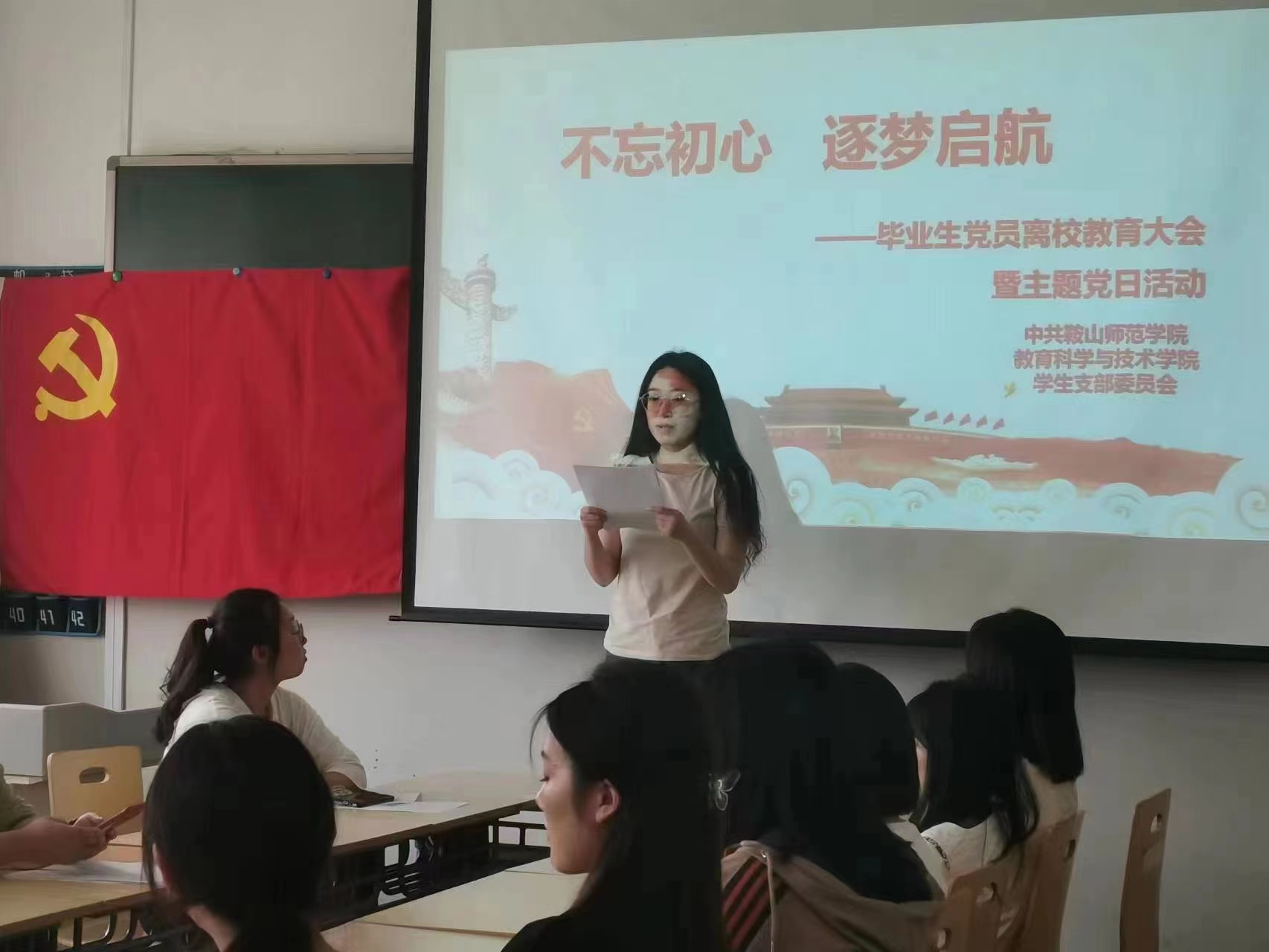 5月31日,教育科学与技术学院开展“不忘初心,逐梦起航”毕业生党员离校教育大会暨毕业生党员主题党日活动。学院党总支副书记、学生党支部书记翟晶、学生党支部组织委员丛湘明、纪检委员刘莹莹及全体2023届毕业生党员参与本次活动。