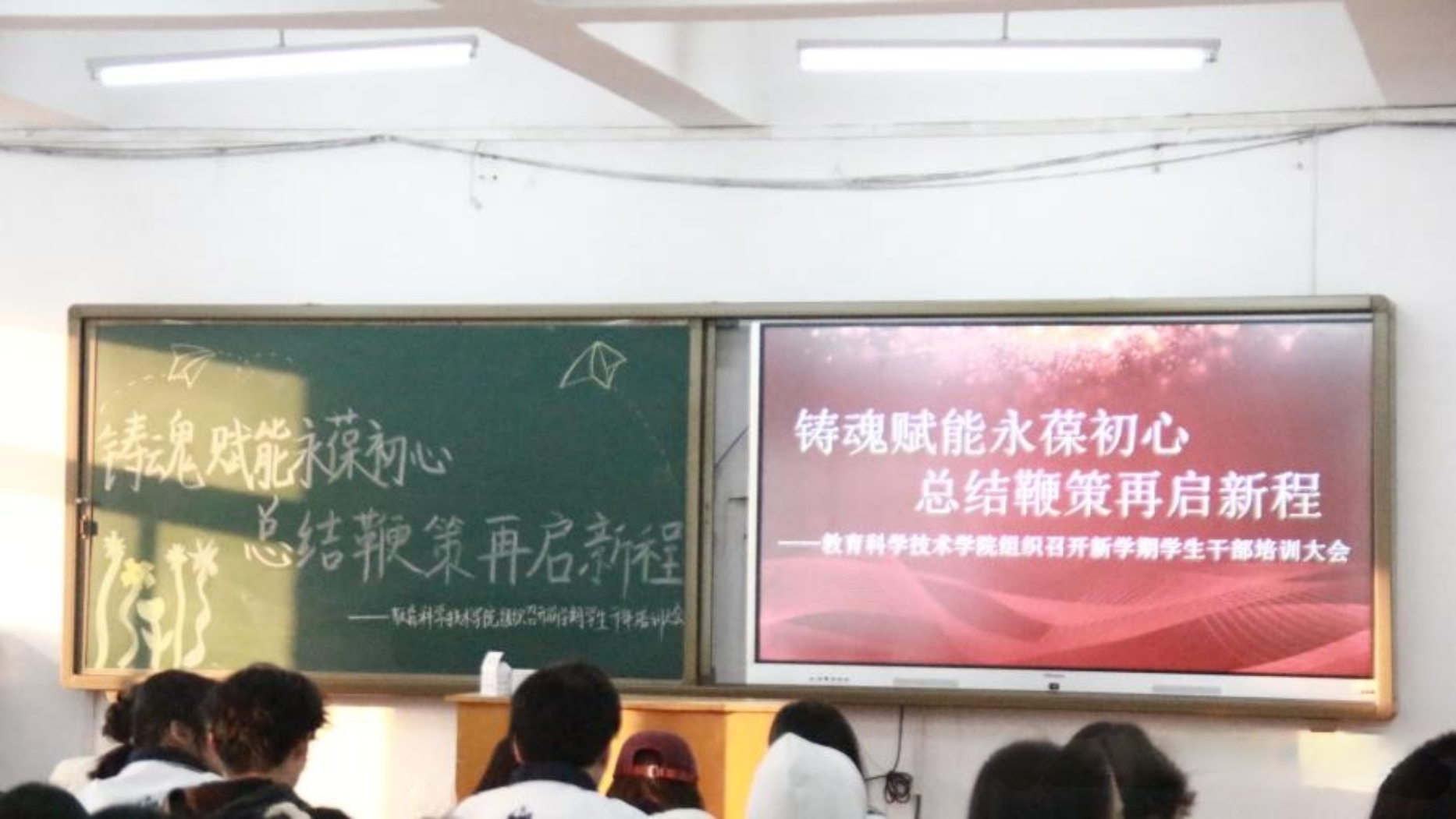 为切实加强学生干部队伍专业化建设,充分发挥学生会“自我教育、自我管理、自我服务”的工作职能,强化学生干部的责任与服务意识,推动学生会工作科学、高效运转。3月18日,教育科学与技术学院组织召开“铸魂赋能永葆初心,总结鞭策再启新程”主题学生干部培训大会,教科院党总支副书记、副院长翟晶老师,学工办主任刘莹莹老师,辅导员黄子琪老师、张岩老师、常家硕老师及全体学生干部参加了本次大会。