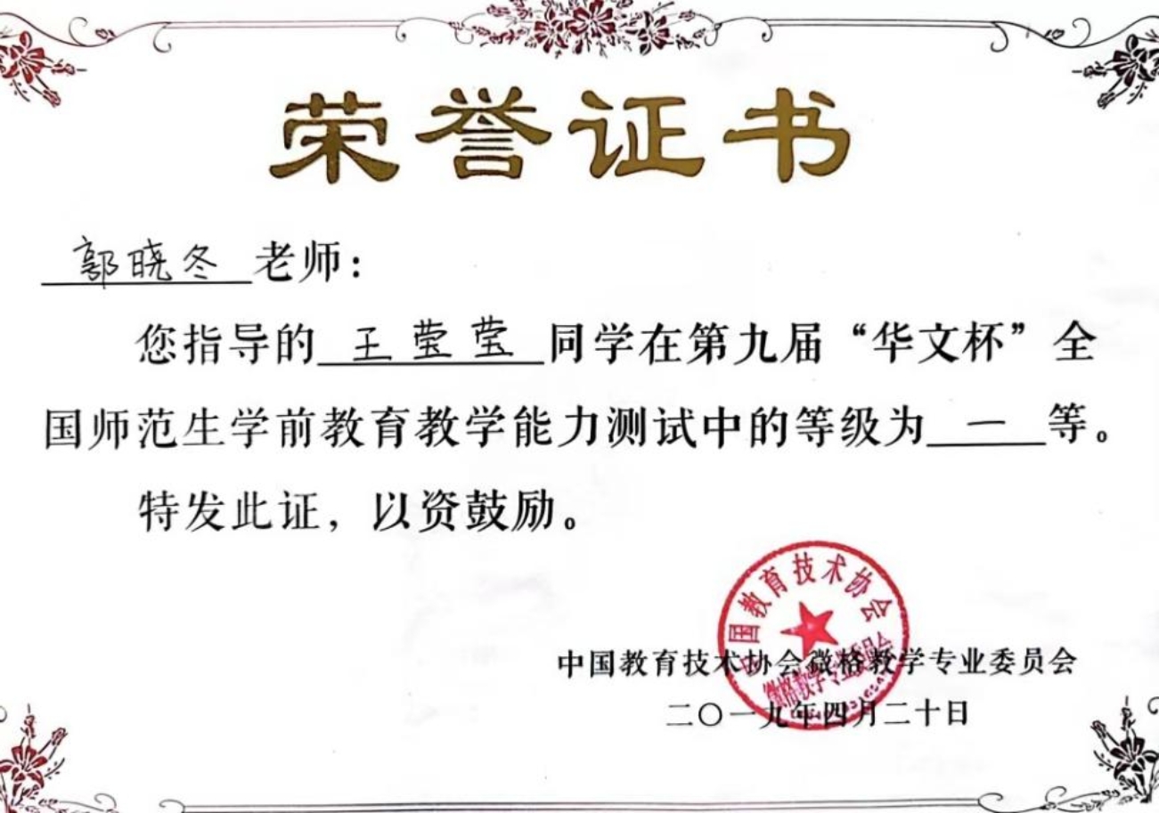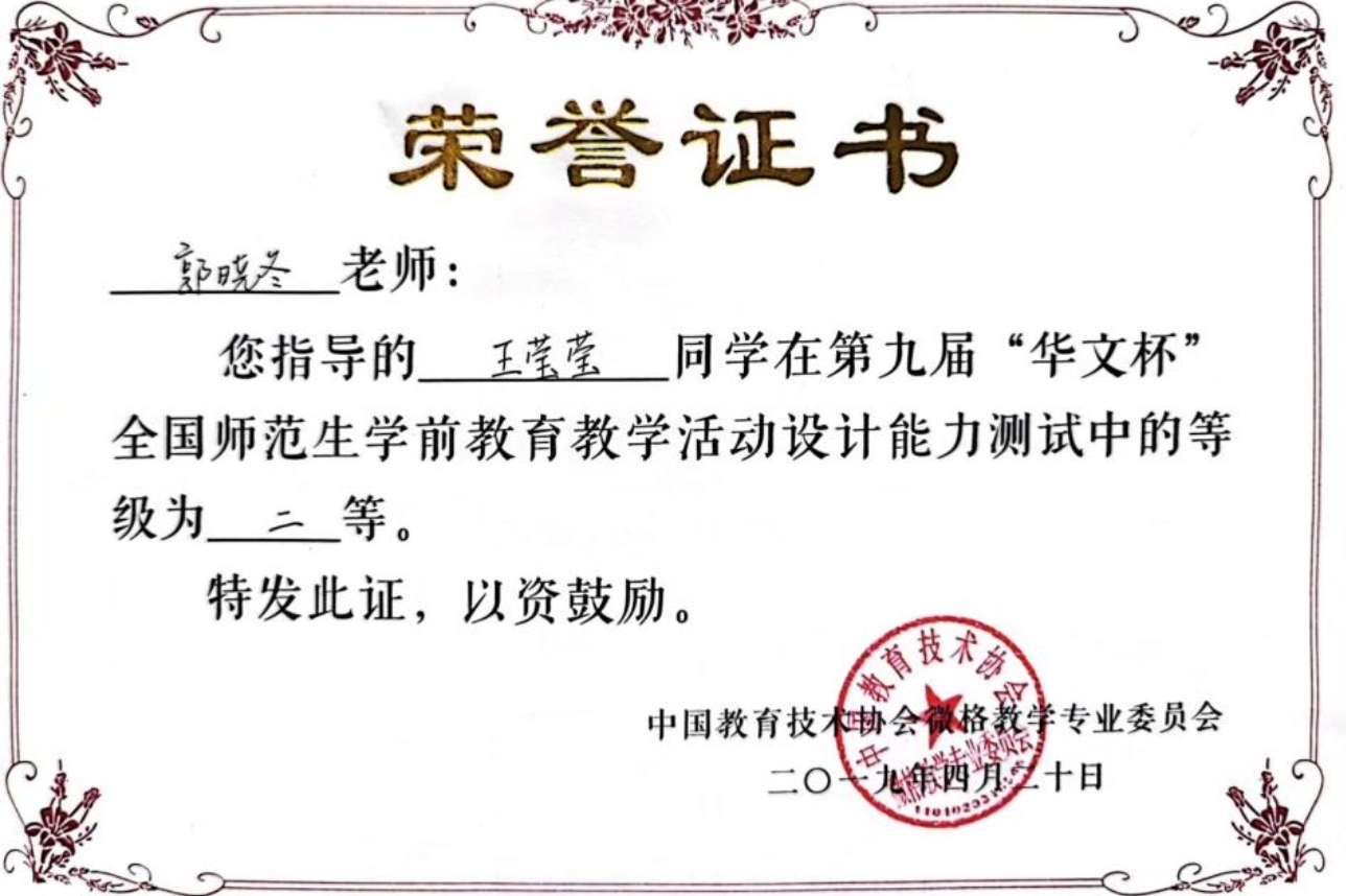 2.其指导学生王莹莹在第九届“华文杯”全国师范生学前教育教学能力测试和教学活动设计能力测试中等级分别为一等和二等。