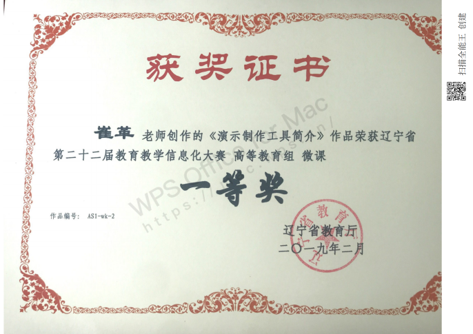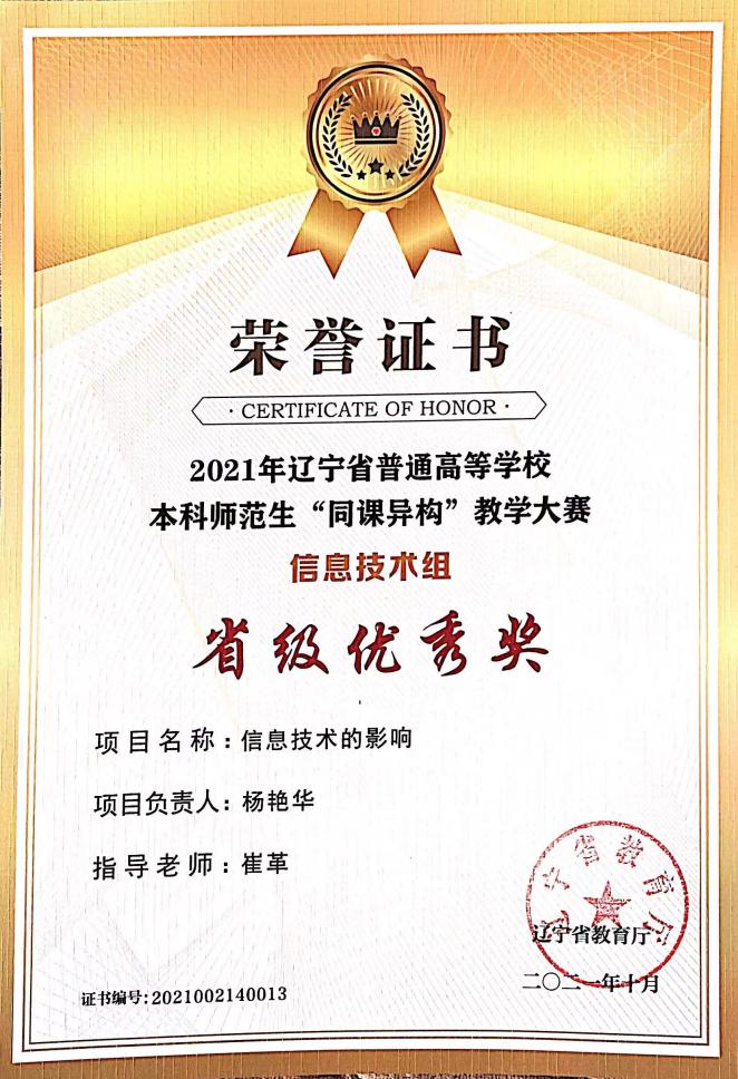 5.在2019年辽宁省第二十三届教育教学信息化大赛高等教育组课件类荣获二等奖。