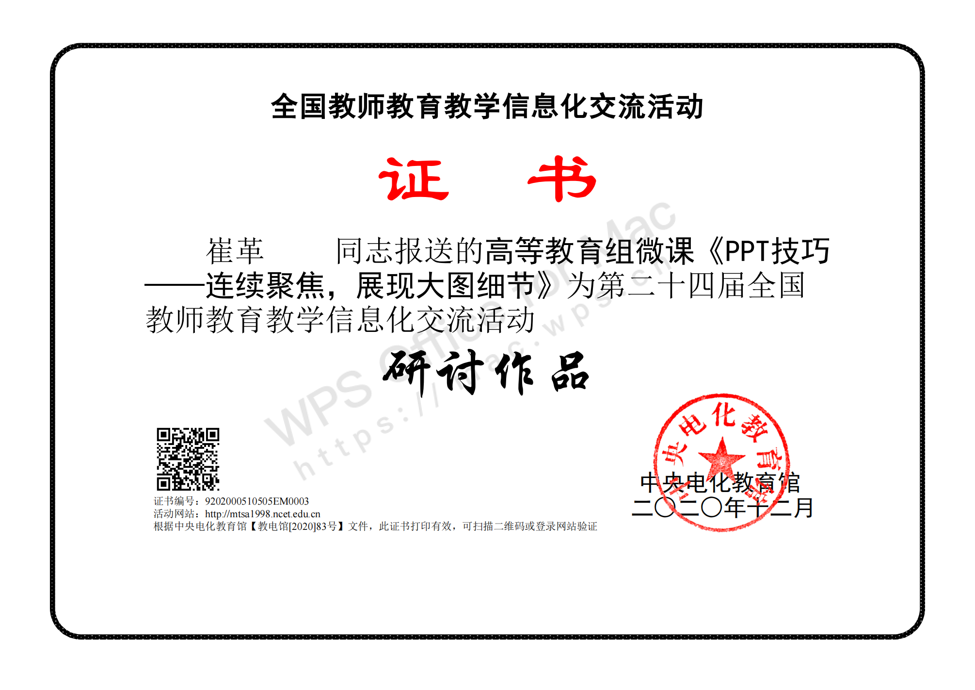 10.在2020年被评为第二十四届全国教师教育教学信息化交流活动研讨作品。