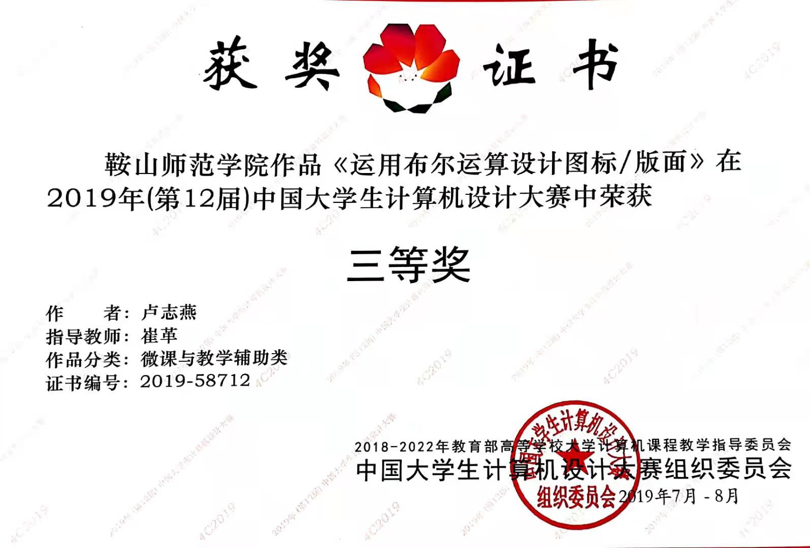 12.在2019年指导学生于第12届中国大学生计算机设计大赛荣获三等奖。