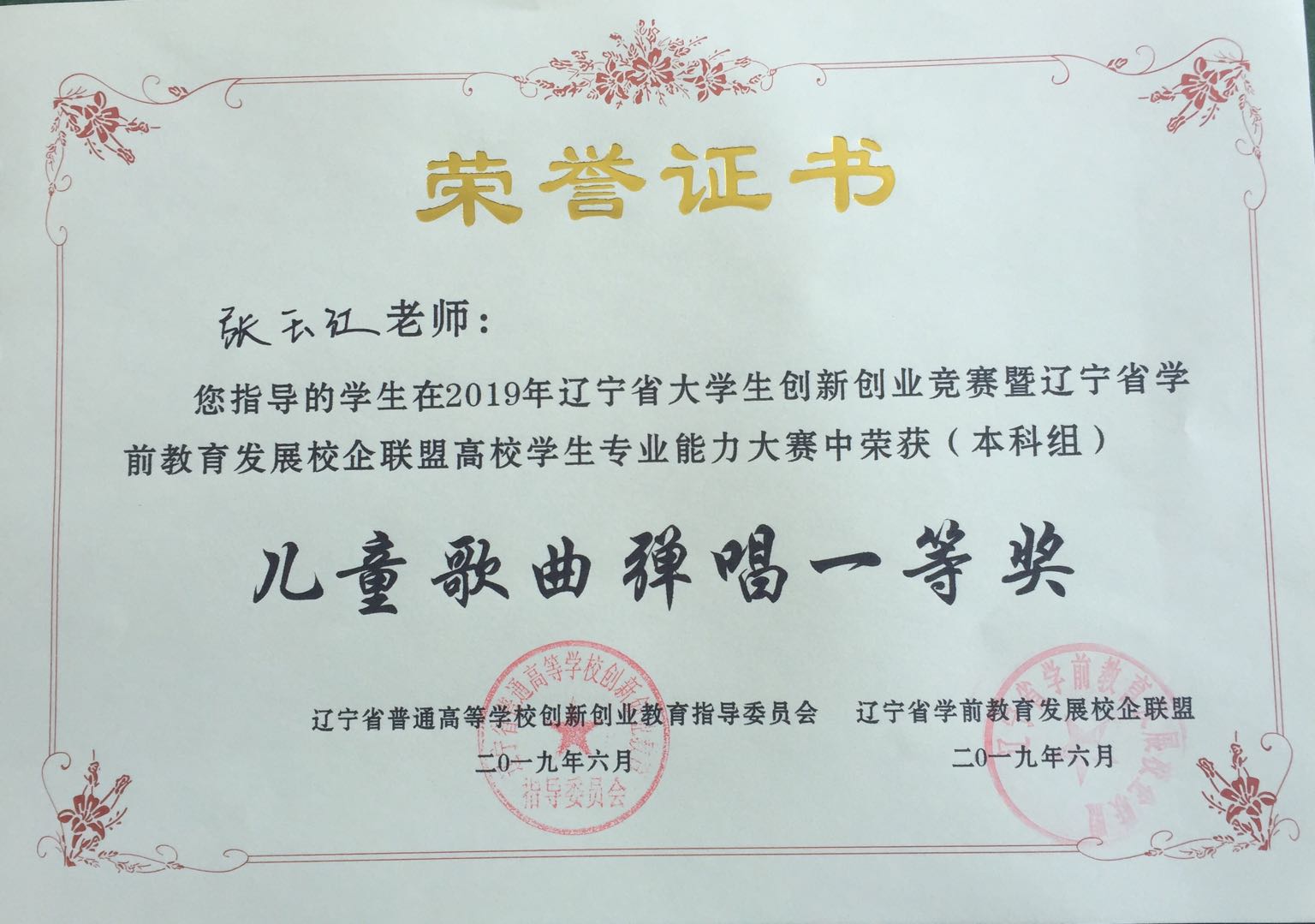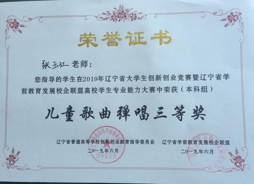 1.2019年指导学生辽宁省大学生创业创新竞赛暨发展校企联盟高校学生专业能力大赛中荣获儿童歌曲弹唱一等奖和三等奖。