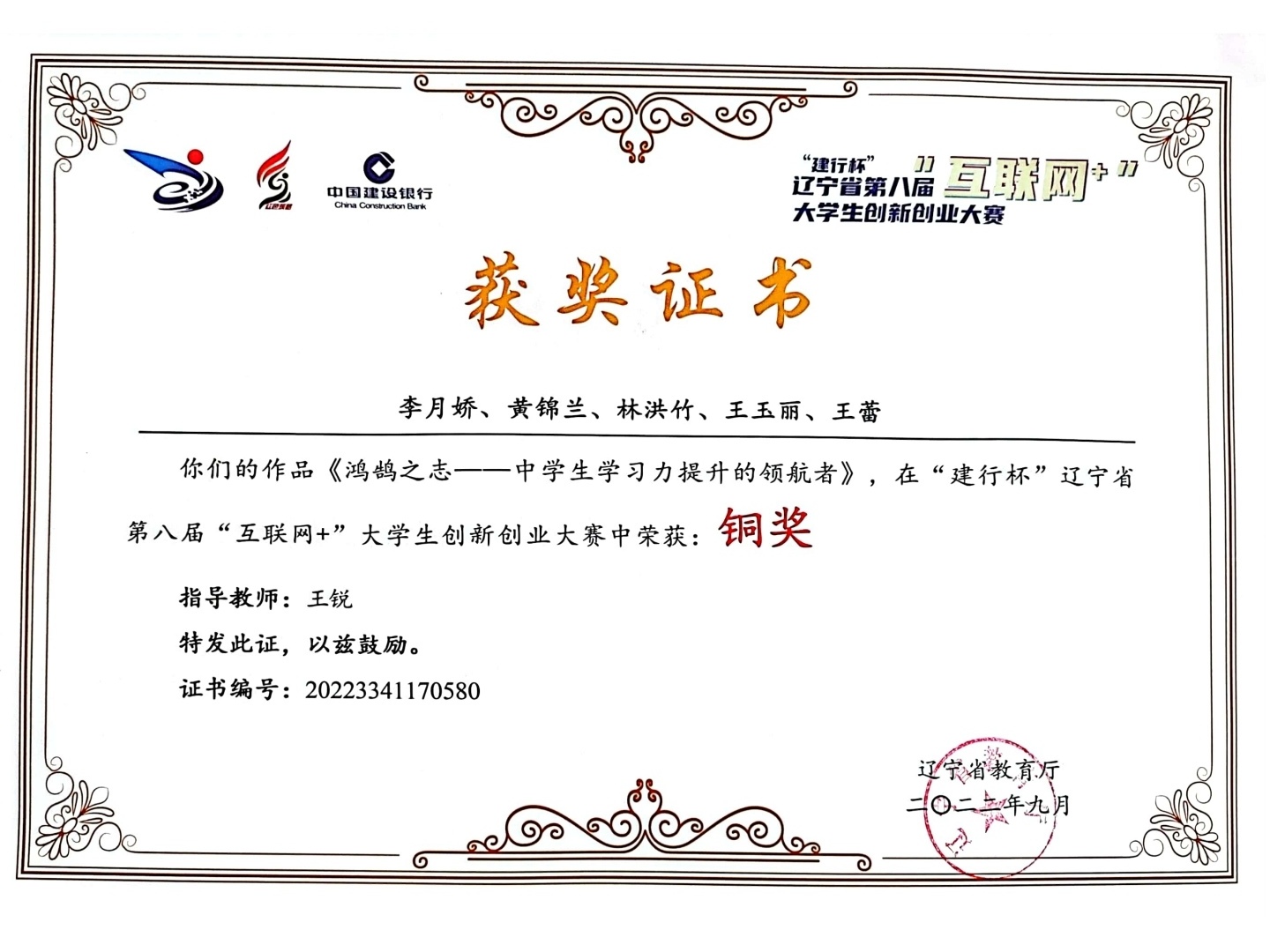 辽宁省第八届互联网+”大学生创新创业大赛中荣获:铜奖